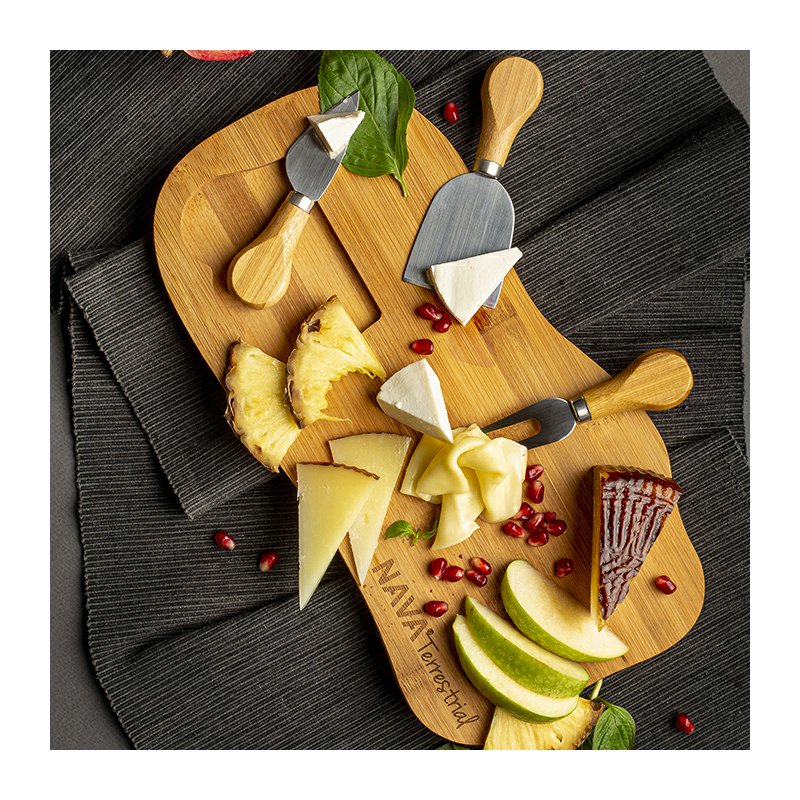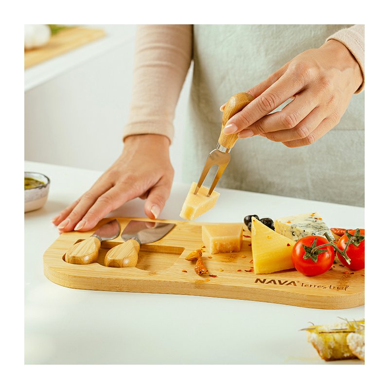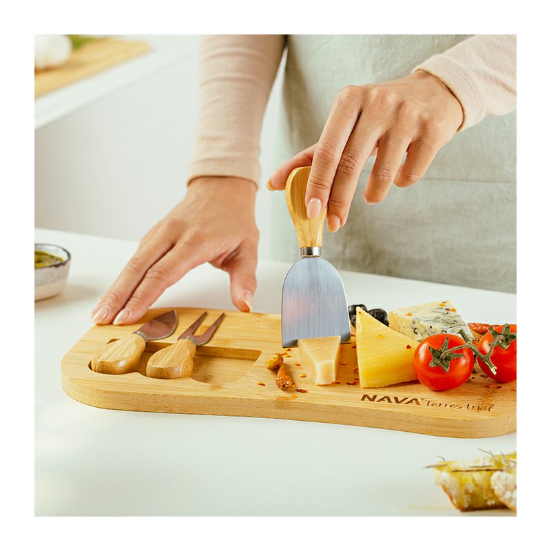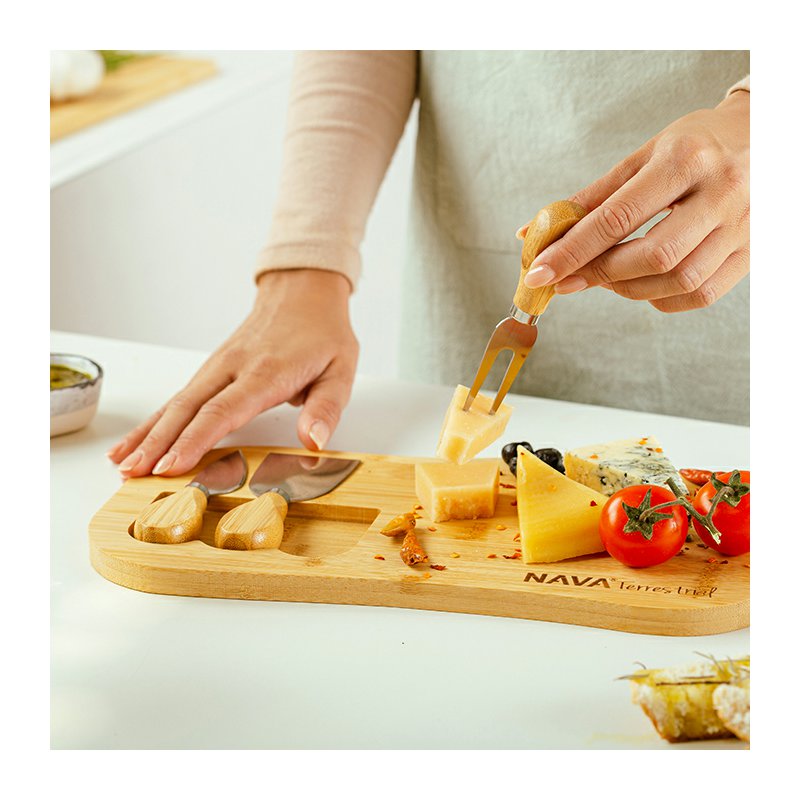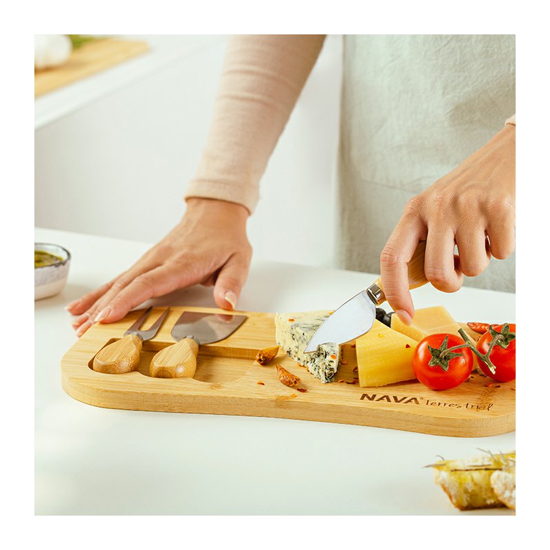 Elegantní bambusové prkénko na sýry NAVA Terrestrial 33 cm s praktickou sadou 3 nožů je ideální pro krájení i servírování sýrů, uzenin a dalších pochoutek. Díky minimalistickému designu dodá vašemu stolování moderní a stylový vzhled.