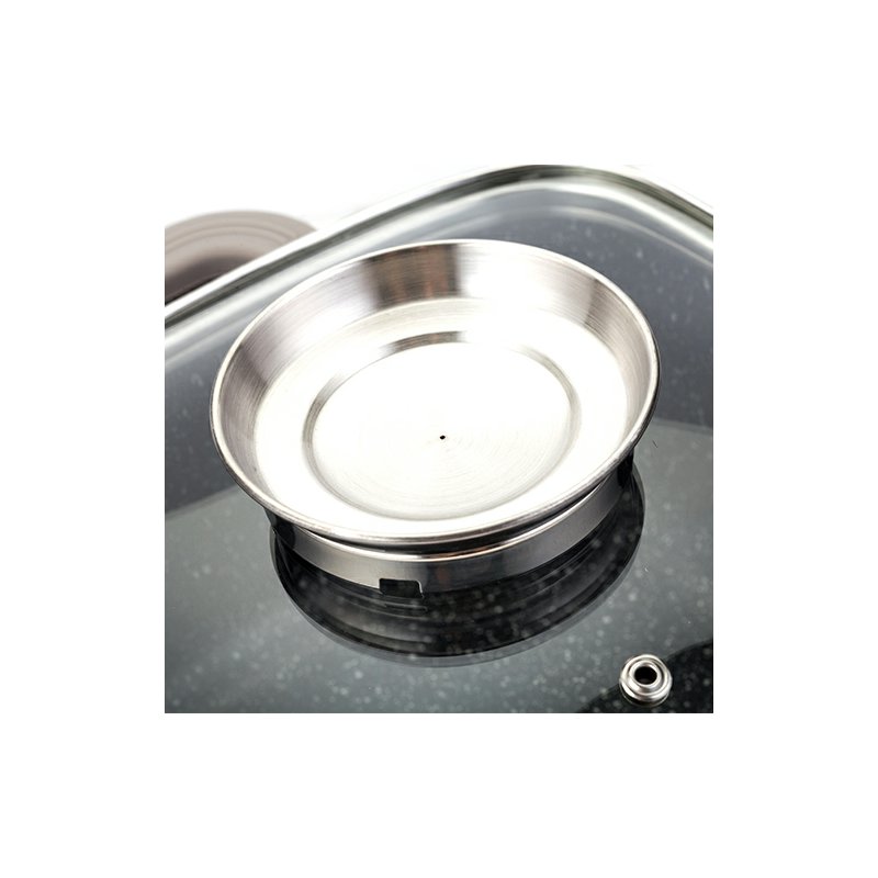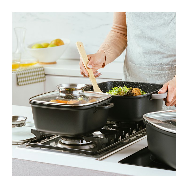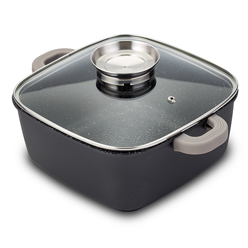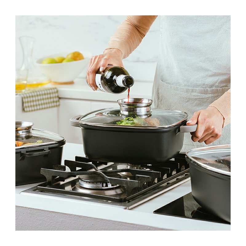 Kompatibilní je se všemi typy varných desek – od plynu až po indukci – a jeho čtvercový tvar se skvěle hodí na pečení masa, zeleniny, zapékaných pokrmů i větších porcí rodinných jídel.
