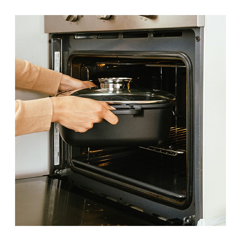 Pekáč se rychle a rovnoměrně zahřívá díky kompaktnímu kovovému tělu a těžkému dnu, což umožňuje úsporné vaření při nižších teplotách. Nepřilnavý povrch zajišťuje maximální pohodlí při vaření, nevyžaduje téměř žádný olej a zároveň umožňuje snadné čištění. Ve výrobě se používají procesy s nízkou uhlíkovou stopou a pekáč je zcela bez PFOA.