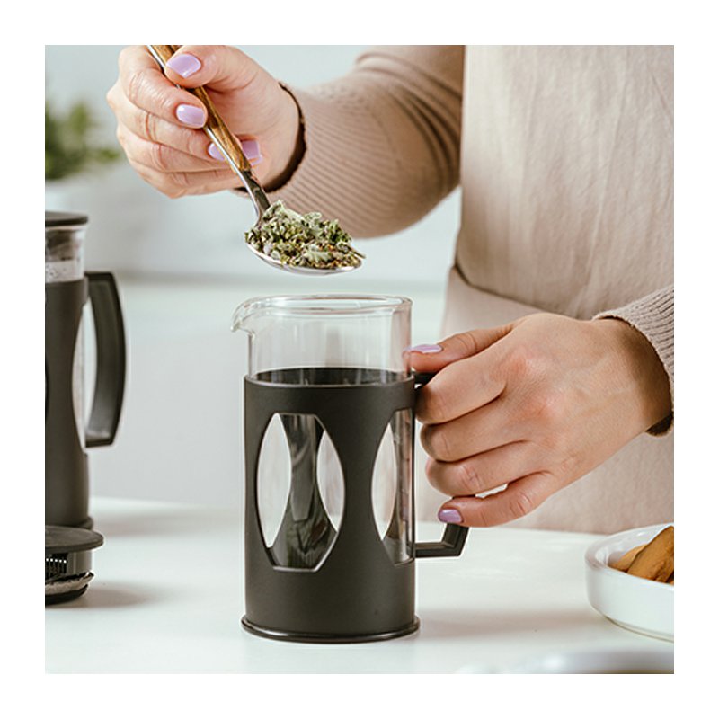 French press NAVA Acer o objemu 0,6 l pro přípravu kávy i čaje. Skleněné tělo, nerezový filtr, ergonomická rukojeť. Vhodný i na cesty. Lze mýt v myčce.