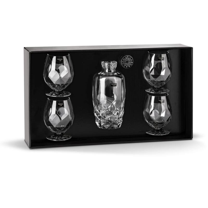 Bohemia Prestige – Sada na brandy/koňak DESIRE je luxusní set z vysoce kvalitního křišťálového skla, který potěší každého milovníka ušlechtilých destilátů. Obsahuje elegantní karafu o objemu 1000 ml a čtyři sklenice o objemu 530 ml, které vynikají originálním brusem kolekce DESIRE.