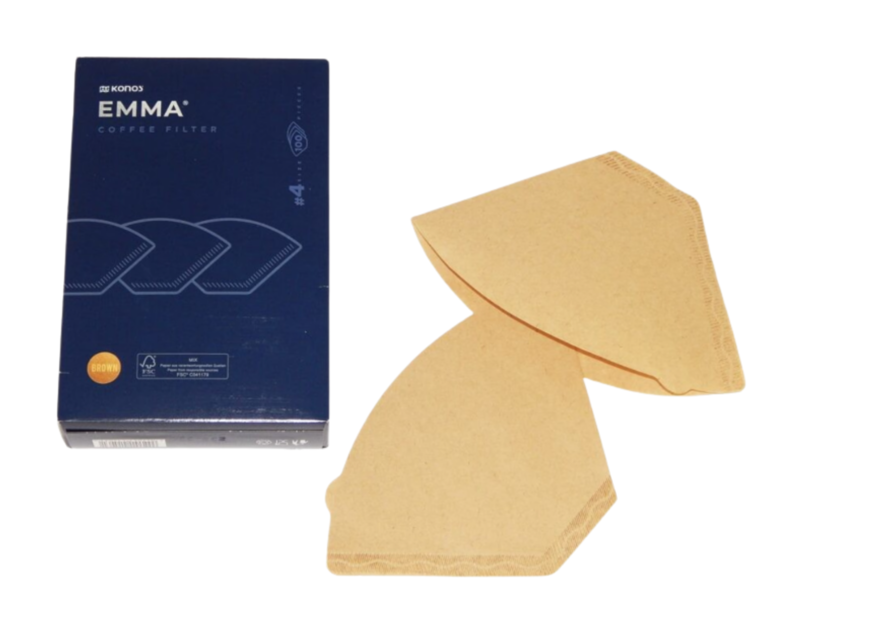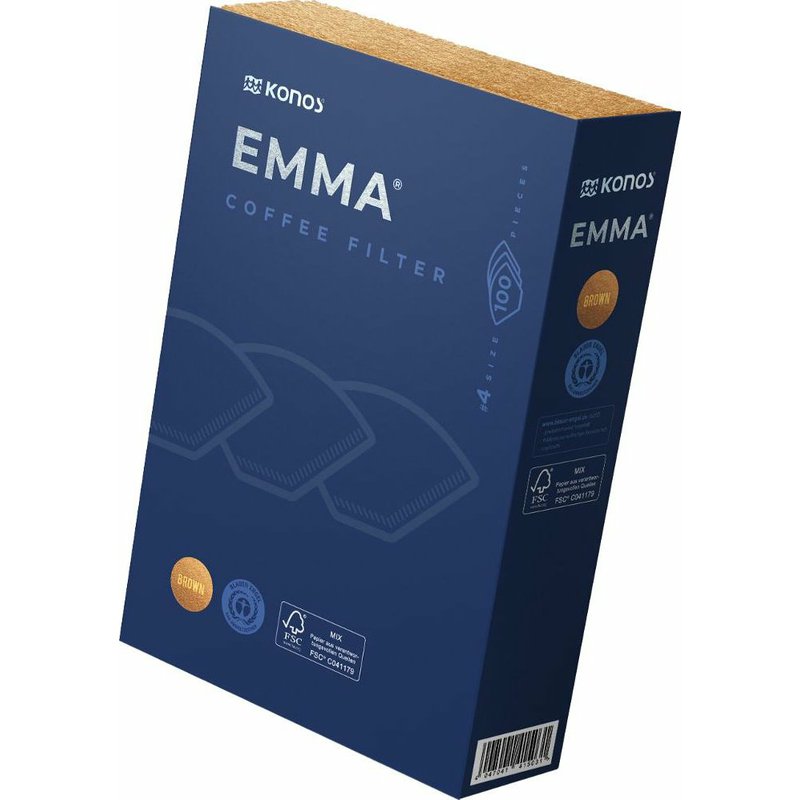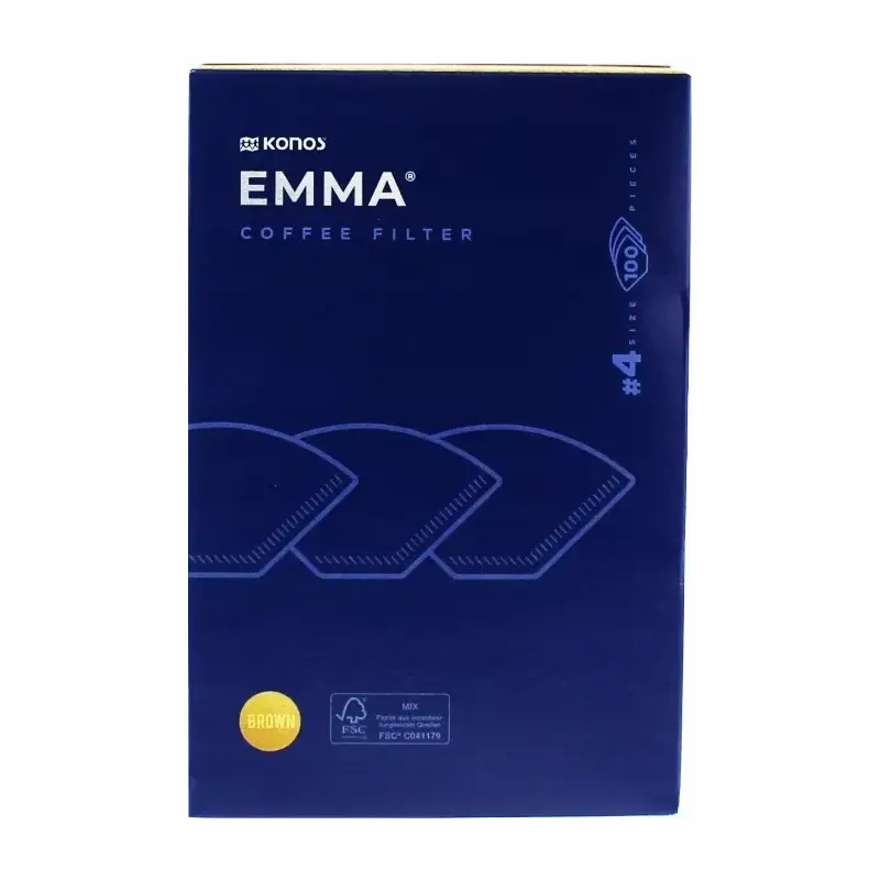Kávové filtry Konos Emma velikosti č. 4 jsou určeny pro jednorázovou přípravu překapávané kávy v běžných překapávačích. Jsou vyrobeny ze 100% buničiny, jsou nebělené a nebarvené, a díky tomu zcela chuťově neutrální – nijak neovlivňují aroma ani chuť vaší kávy.