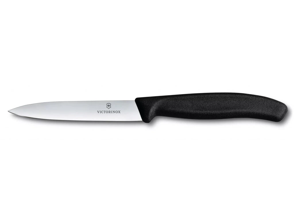 Velmi ostrý kuchyňský nůž od švýcarské firmy Victorinox. Hladké ostří je dlouhé 10 cm.
