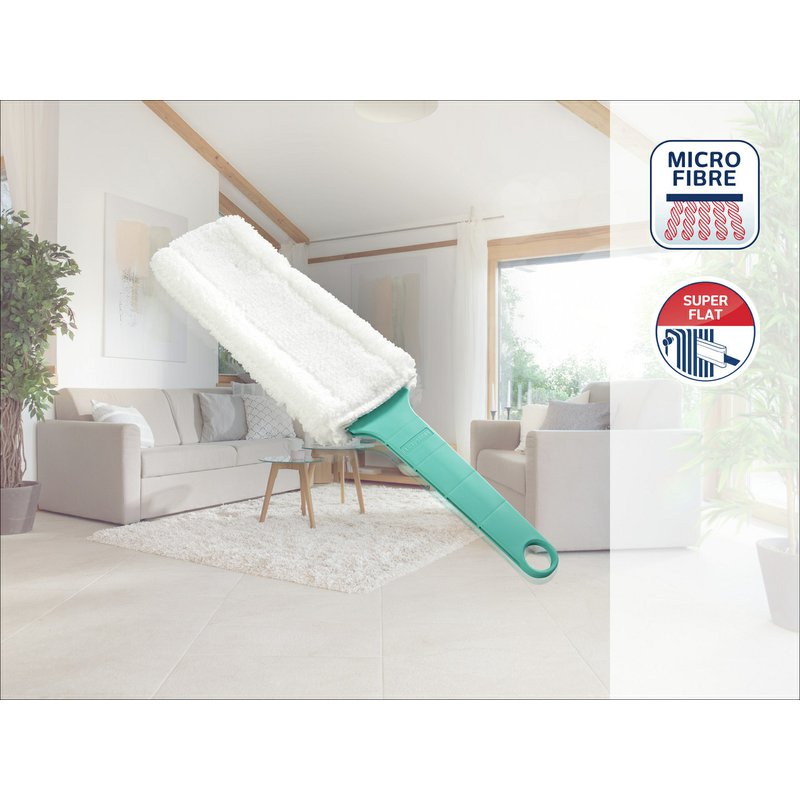 Odnímatelný a pratelný návlek umožňuje jednoduchou údržbu a dlouhodobé používání. Praktické kombinace bílá a tyrkysová navíc dodává válečku moderní vzhled. Váleček je vyroben z plastového těla a mikrovlákna, které je šetrné k povrchům, ale zároveň účinné proti usazenému prachu.