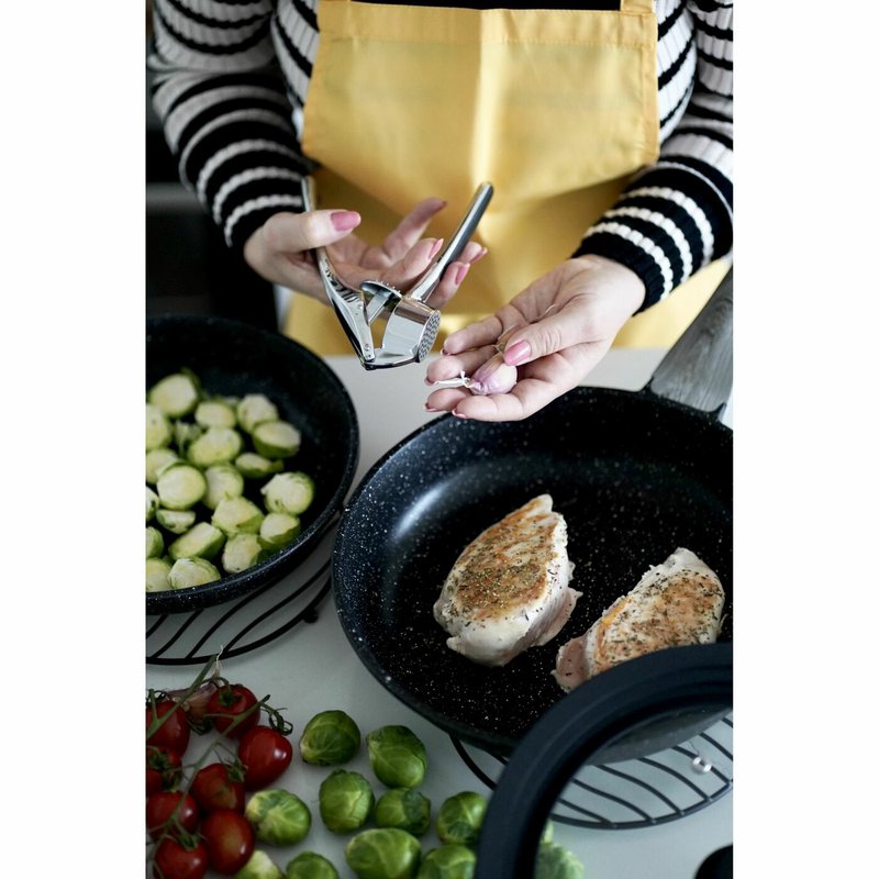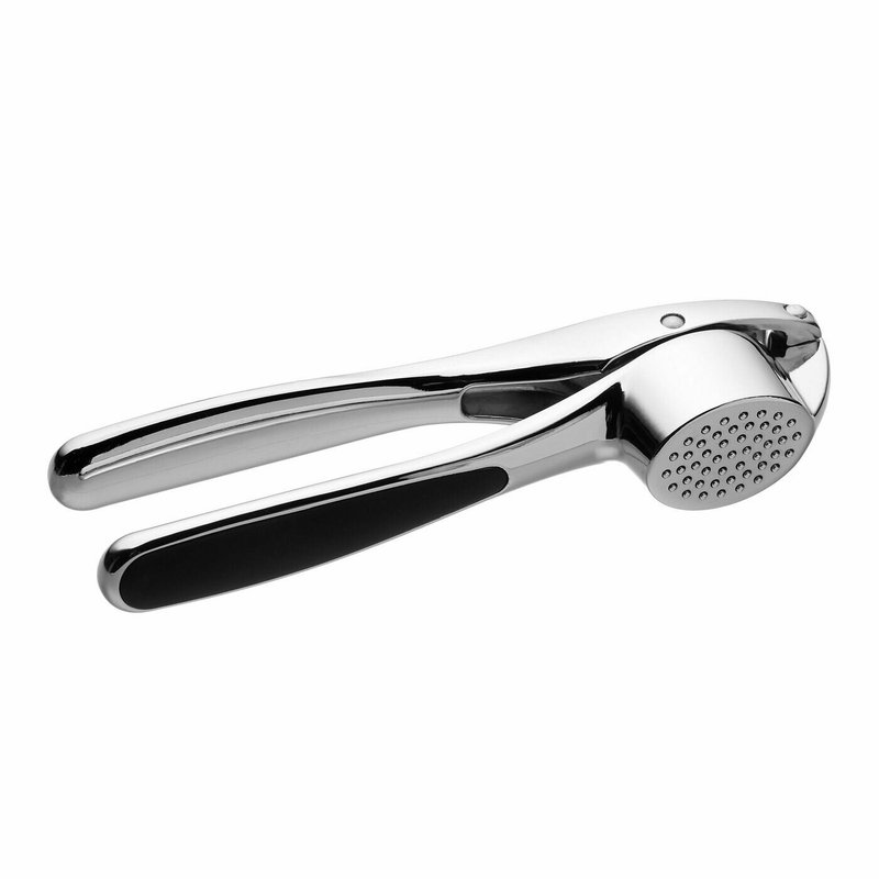 Tělo lisu je vyrobeno z hygienické slitiny nerezové oceli, která je odolná vůči korozi i pachům. Ergonomická rukojeť s měkkými černými panely zajišťuje bezpečný a pohodlný úchop, ať už pracujete s malým nebo větším množstvím česneku.