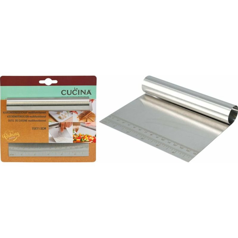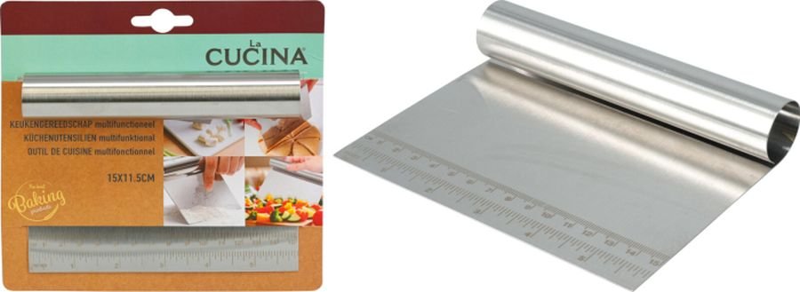 Praktická nerezová kuchyňská stěrka s integrovanou měrkou je univerzální pomocník pro pečení i vaření. Skvěle se hodí pro práci s těstem, porcování, stírání surovin z pracovní plochy i mís a zároveň umožňuje orientační měření díky přehledné měrné stupnici.