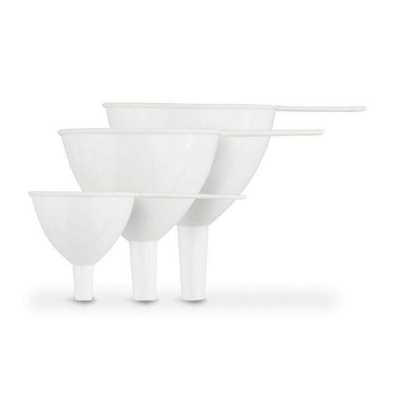 Jsou vyrobeny z odolného plastu vhodného pro styk s potravinami, který je bezpečný, lehký a snadno se čistí. Trychtýře pomáhají minimalizovat riziko rozlití a zároveň zajišťují přesné a plynulé lití tekutin i sypkých surovin.