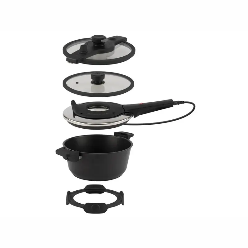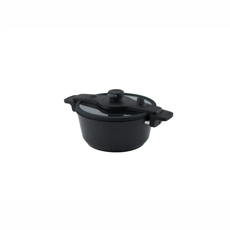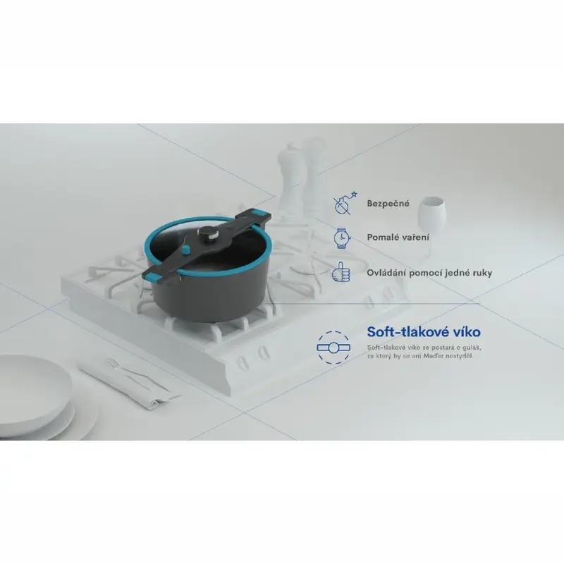 Jedinečnou výhodou je soft-tlakové víko, které umožňuje dušení pod mírným tlakem. Potraviny si zachovají více chuti, šťavnatosti i vitamínů, přičemž nehrozí riziko jako u klasických tlakových hrnců. Patentované uzavírání umožňuje manipulaci jednou rukou.