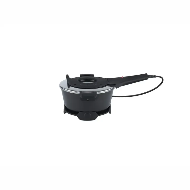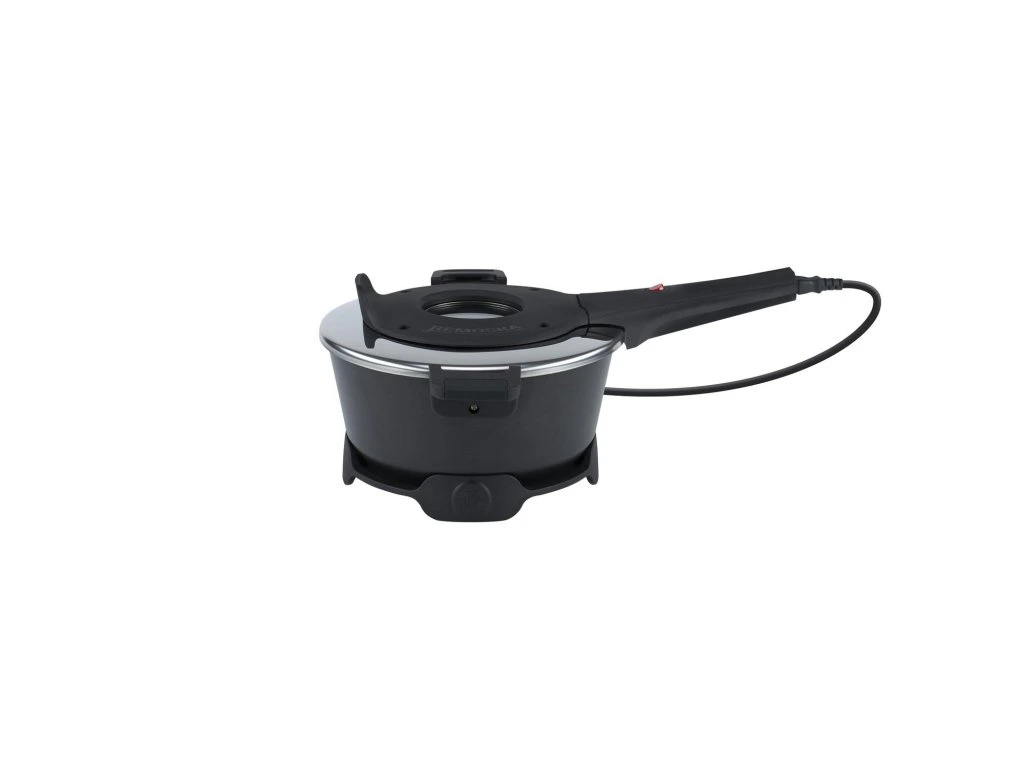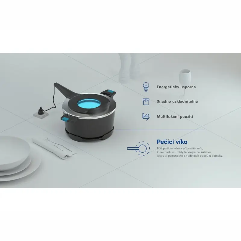 Multicooker Remoska® Tria Black T41/46 představuje nejnovější generaci oblíbené české Remosky. Unikátní systém jednoho hrnce a tří vík kombinuje hned tři spotřebiče v jednom – pečicí mísu, klasický hrnec a soft-tlakový hrnec. Stylový design doplňují silikonové prvky v elegantní modré barvě.
