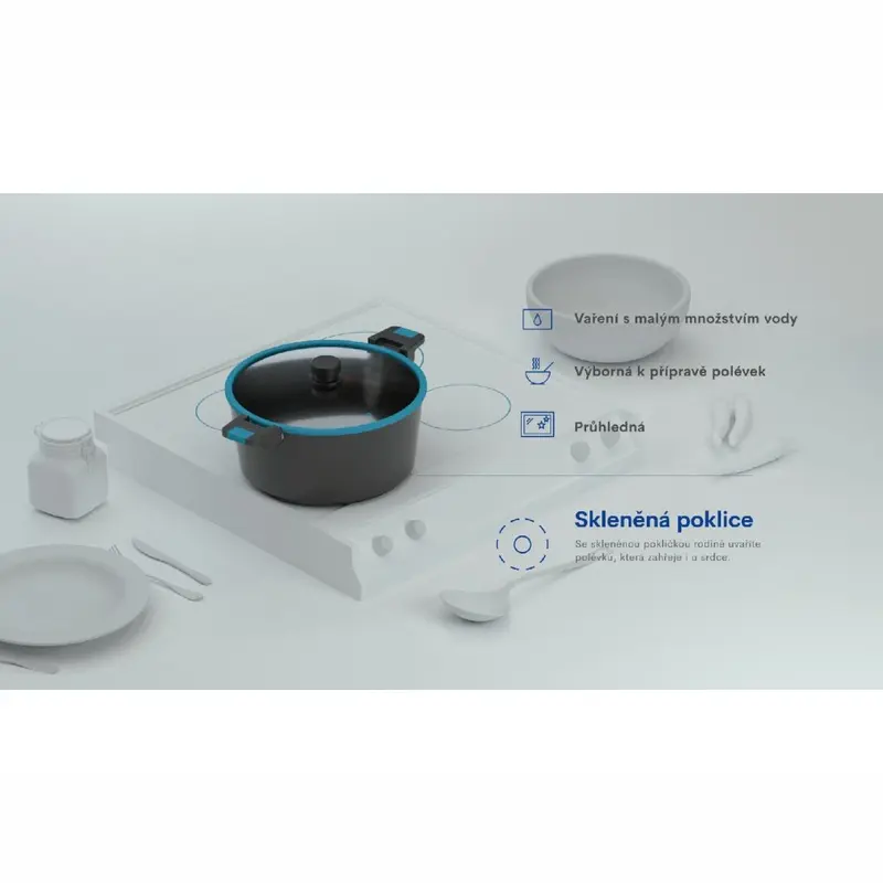 Hrnec je vhodný i do trouby až do 220 °C. Skleněná poklice je vyrobena z tvrzeného bezpečnostního skla a silikonové prvky zajišťují správné dosednutí i regulaci páry. Součástí balení je také praktický stojan z teplotně odolného plastu.