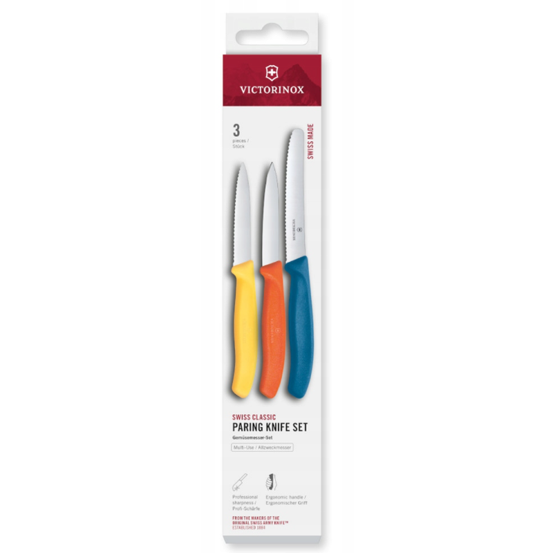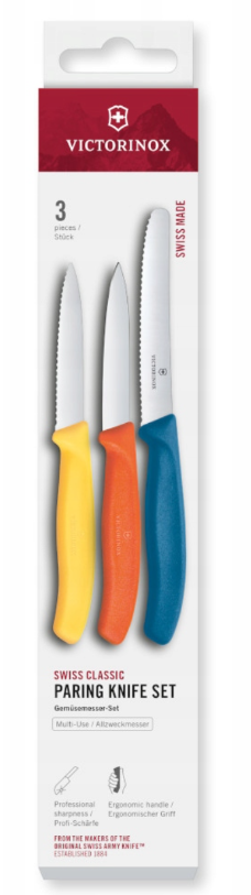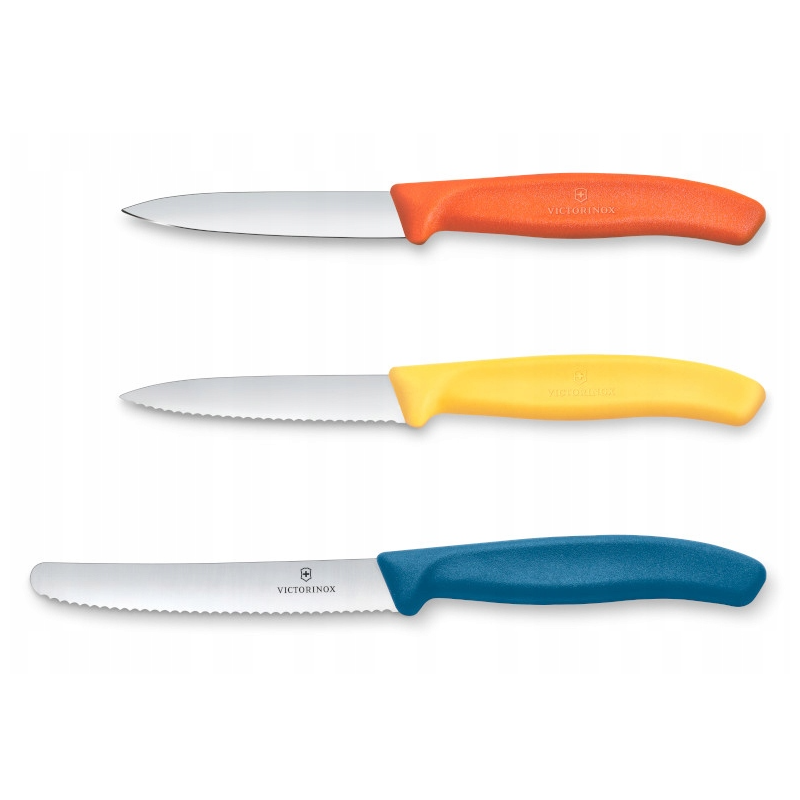 Sada kuchyňských nožů Victorinox Swiss Classic obsahuje tři špičkové nože s různými typy čepelí – hladkou, vlnkovanou a vlnkovanou s úzkou ostrou špičkou v barvách oranžová, žlutá a modrá.