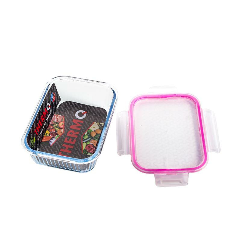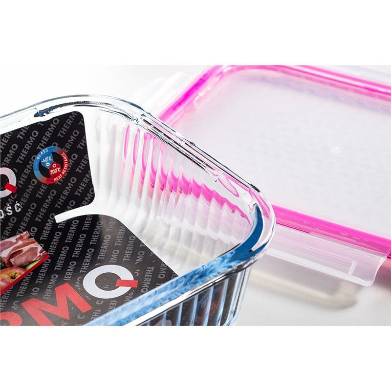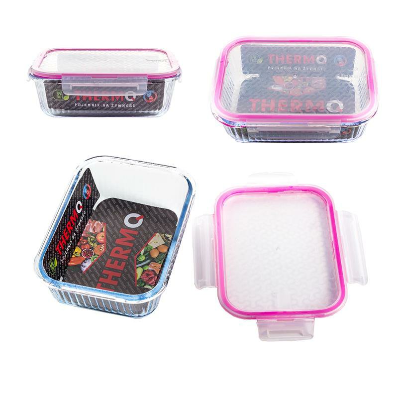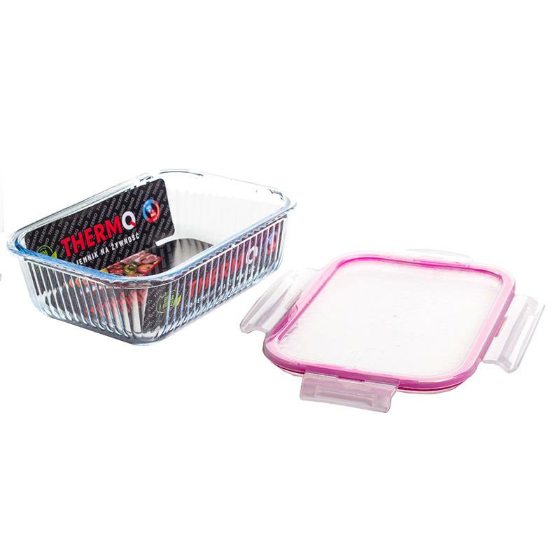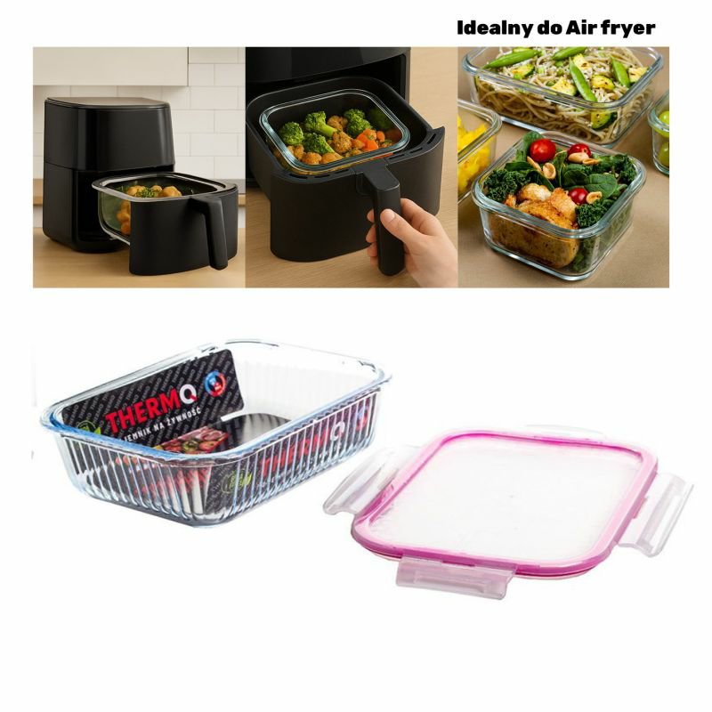 Tepelně odolná skleněná nádoba na potraviny s uzávěrem – Thermo je praktická a stylová volba pro každou domácnost i do práce. Vyrobena z vysoce kvalitního žáruvzdorného skla, nabízí bezpečné uchovávání potravin při vysokých i nízkých teplotách. Je také vhodná do horkovzdušných fritéz! Robustní plastové víko se západkami a růžovým silikonovým těsněním zajišťuje vzduchotěsnost a zabraňuje úniku pachů, což prodlužuje čerstvost vašich jídel.