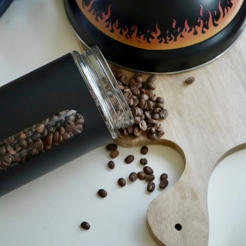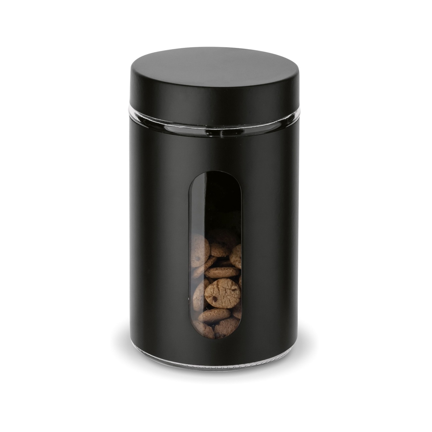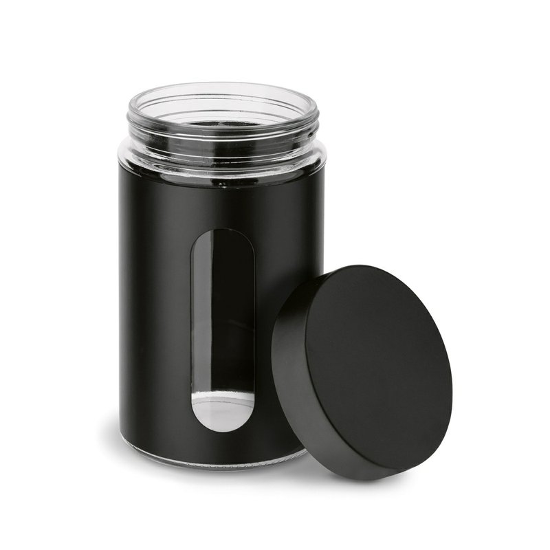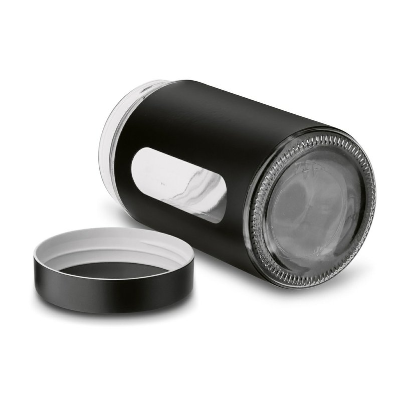 Nádoba je vyrobena z odolného sodnovápenatého skla, díky kterému máte okamžitý přehled o obsahu i jeho množství. Kovové víko se šroubovacím uzávěrem zajišťuje ochranu před vlhkostí, prachem a dalšími vnějšími vlivy. Celá nádoba je chráněna elegantním černým ocelovým pouzdrem s práškovou povrchovou úpravou, které jí dodává moderní vzhled a zvyšuje její odolnost.