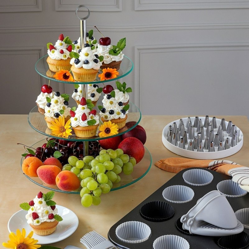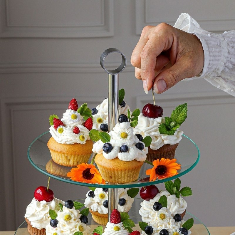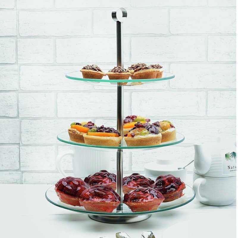 Skleněná etažerka Tadar Carmen 20/25/29 cm je elegantní kulatý třípatrový stojan, který vám umožní servírovat dorty, zákusky, ovoce nebo jiné pochoutky s maximálním efektem. Díky třem úrovním ušetříte místo na stole a vaše dezerty získají reprezentativní vzhled.