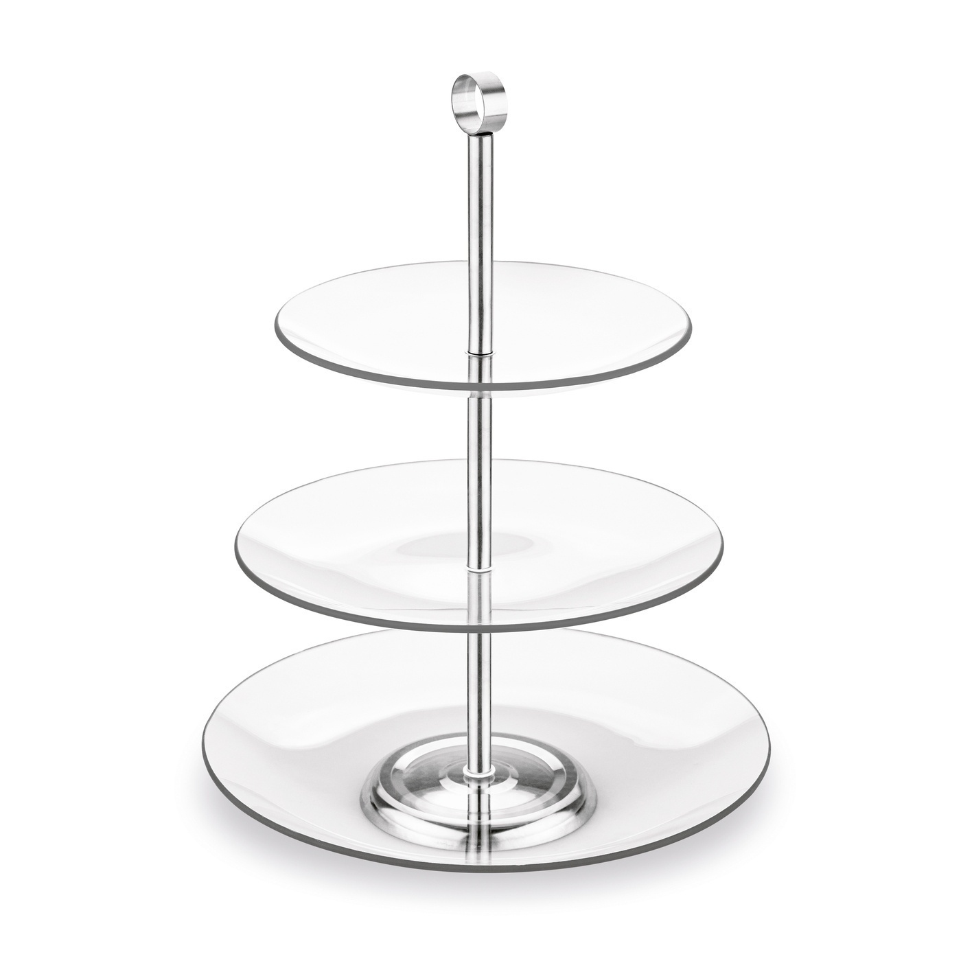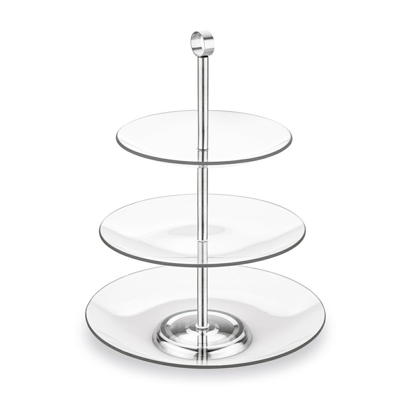 Talíře jsou vyrobeny z odolného tvrzeného skla a spojovací prvky z nerezové oceli, což zajišťuje pevnost, hygienu a snadné čištění. Konstrukci lze snadno rozebrat, takže po oslavě nebo posezení s rodinou etažerku jednoduše uskladníte naplocho.
