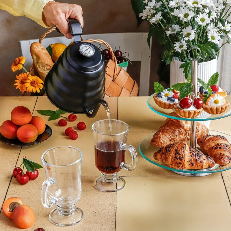 Vysoká stopka zajišťuje stabilitu a zároveň chrání ruce před horkým povrchem sklenice. Ergonomické ucho umožňuje bezpečné a pohodlné držení při pití horkých nápojů.