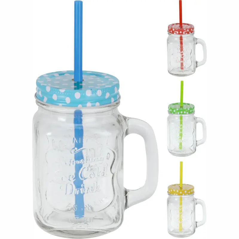 Stylová sklenice 400 ml s uchem, víčkem a brčkem – ideální na limonády, domácí sirupy, koktejly nebo dětské nápoje. Skvělá volba pro pikniky, grilování nebo párty.