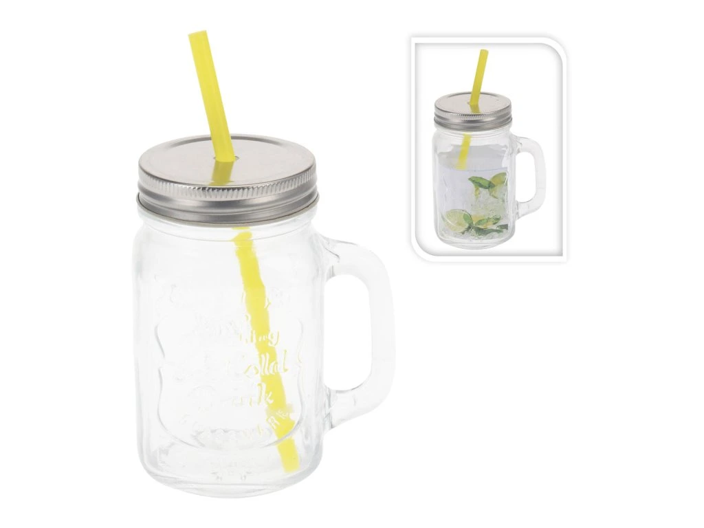 Stylová sklenice 450 ml s uchem, víčkem a žlutým brčkem – ideální na limonády, domácí sirupy, koktejly nebo dětské nápoje. Skvělá volba pro pikniky, grilování nebo párty.