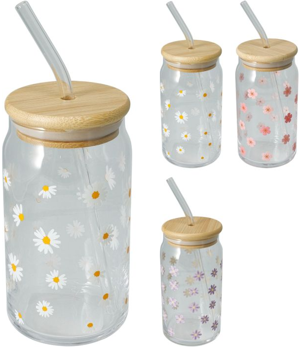 Stylová sklenice 500 ml s bambusovým víčkem a skleněným brčkem je ideální pro servírování limonád, džusů i osvěžujících nápojů během celého dne. Jemný květinový dekor dodává sklenici elegantní vzhled a zpříjemní každodenní stolování.
