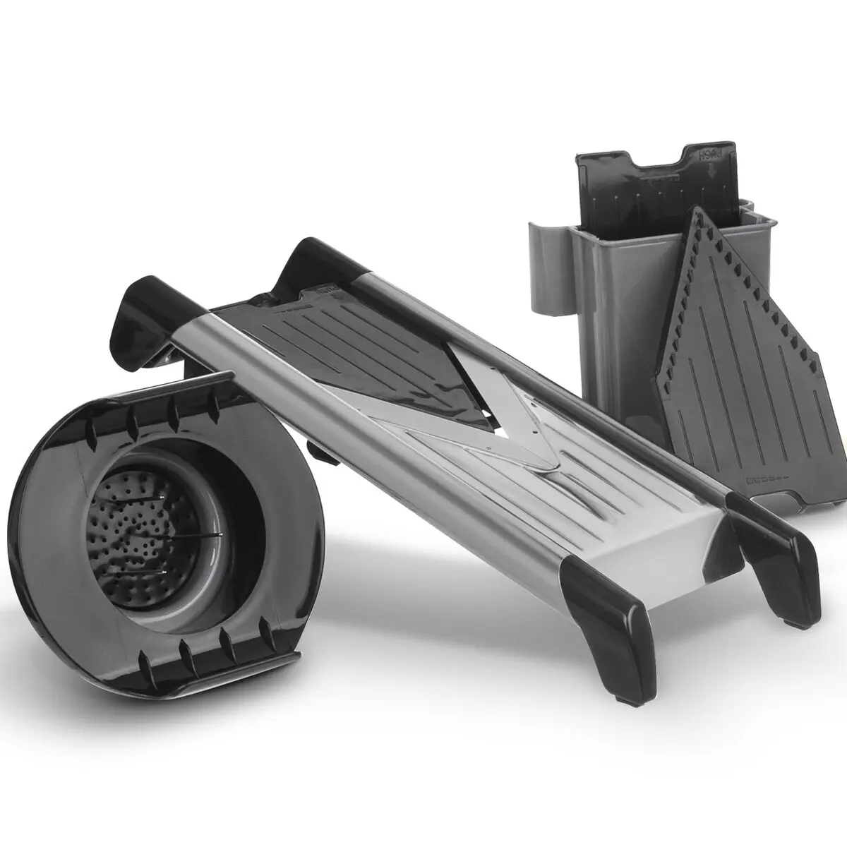 Sklápěcí protiskluzové nožičky zajišťují stabilitu a správný náklon při práci, přitom po složení šetří místo při skladování. Praktický zásobník na nástavce lze nasadit přímo na tělo struhadla, takže máte vše přehledně po ruce. Kráječ je vyroben z kvalitních plastů ABS, PP a TPR a lze jej mýt v myčce nádobí.