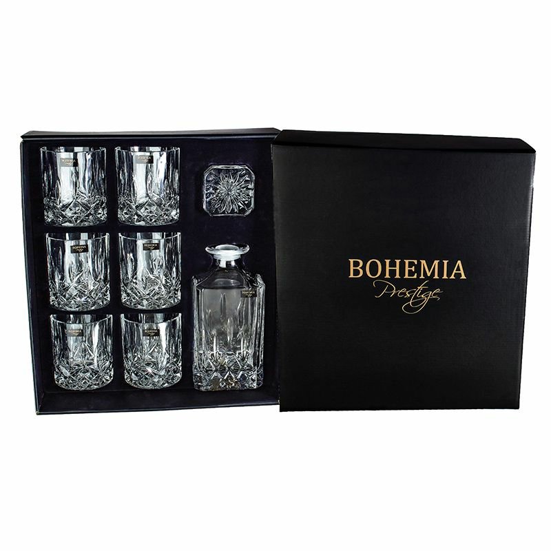 Sada whisky Bohemia Prestige Classico 1+6 ks je symbolem tradiční elegance a sklářského mistrovství. Luxusní whisky set z křišťálového skla obsahuje karafu a šest sklenic, které vynikají svou brilantní čirostí, odolností a nadčasovým designem.